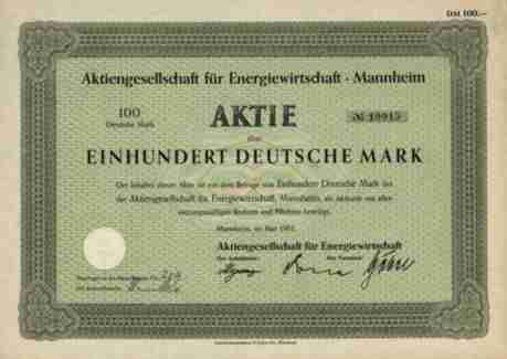 Aktiengesellschaft für Energiewirtschaft , 1000 DM, Mannheim, Mai 1951, Art.Nr.1252a, Preis 39,00 EUR