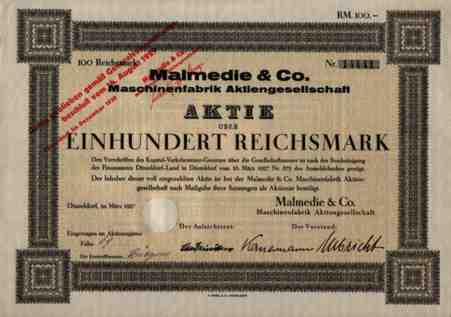 Gegründet am 17.8.1898; eingetragen am 2.9.1898; hervorgegangen aus der unter der Firma Malmedie & Cie. zu Düsseldorf-Oberbilk betriebenen Maschinen-Fabrik.