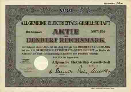 und wurde in Allgemeine Elektricitäts-Gesellschaft (AEG) umbenannt. Vielfältige Beteiligungen, u.a.: Bayerische Zugspitzbahn AG Garmisch; Borsig Lokomotiv-Werke