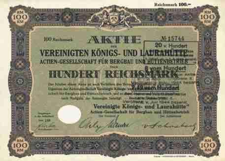 | Vereinigte Königs- und Laurahütte A.G. für Bergbau und Hüttenbetriebe | 100 RM | Art.Nr.0850 |
