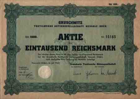 Gruschwitz & Söhne, Neusalz. Beteiligungen bis 1943: 1. Duncan's Leinen-Industrie GmbH, Großschweidnitz und versch. kleinere