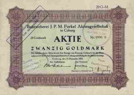 | Aktie 100 Goldmark, Coburg den 15.12.1924 Gründung am 22.1.1923 zur Weiterführung der Forkel'schen mechanischen Buntweberei. Herstellung und Handel von Textilwaren und von verwandten Artikeln. In der Weltwirtschaftskrise geriet der Betrieb in die Verlustzone und ging schließlich 1937 in Liquidation. Immerhin erhielten die Aktionäre noch eine Gesamtliquidationsrate von 62,9 %. Mit 4 Stempel der Liquidationsraten. Gedruckt bei der Wiedemannsche Druckerei AG, Saalfeld in Thüringen. |