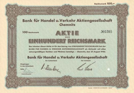 | Gegründet am 12.11.1883. Betrieb von Bank- und Handelsgeschäften (einschl. Versicherungen) aller Art, insbesondere zur Förderung der mittelständischen Industrie, des Handels und Gewerbes. Früher eingetragene Genossenschaft mbH. Firma bis 5.9.1917: Chemnitzer Viehmarktsbank, danach: Bank für Handel u. Verkehr AG. 1963 Abwicklung von Westvermögen durch die Preußische Staatsbank (Seehandlung), Berlin (West); Aktien seit 1994 kraftlos. |