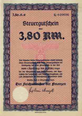 | Die Steuergutscheine konnten vom 1. April 1945 bis 31. März 1946 bei allen Finanzkassen des Deutschen Reichs eingelöst werden. Die Steuergutscheine von 1937 Serie A (Ausländerstücke) waren zinslose Inhaberwertpapiere (wertpapierähnliche Schuldurkunden), ausgegeben vom Reichsfinanzministerium. Die Steuergutscheine wurden an allen deutschen Börsen gehandelt und unterlagen den Vorschriften des Depotgesetzes. Ausgegeben wurde die Serie B für inländische Bezugsberechtigte (und die Serie A für ausländische Bezugsberechtigte). Die Ausländerstücke wurde im Unterdruck des Steuergutscheins mit einem „A“ gekennzeichnet. In der Nachkriegsregelung von 1957 der Reichsschulden in der BRD wurden die Steuergutscheine von 1937 nicht entschädigt. Dekorativer Druck der Reichsdruckerei Berlin mit Reichsadler auf Kreuz mittig und geprägt im Trockensiegel. |
