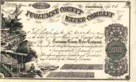 Gründung 1851. Aktienausgabe ab September 1852. Golderzabbau und Goldgewinnung. 1862 wurde eine Mehrheit der Aktien an John Wallace ausgegeben. Er war ein wichtiger Ingenieur des Unternehmens und bereits Assistenzingenieur bei der Firmengründung. Dekorativer Druck von Britton & Rey in San Francisco mit großer Abb. einer Goldwaschanlage mit Goldwäschern links. Es wird der damalige Gewinnungsablauf des Goldes abgebildet. Oben Wasserhaus mit Zuleitung, vers. Waschbahnen, Schatzmeister und Kutschen zum Abtransport unten.